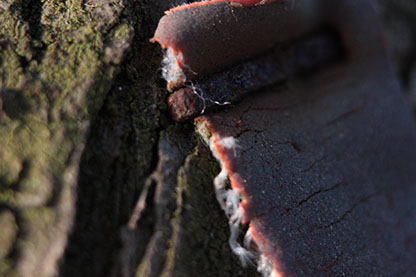 L’agrafe a transpercé une écorce et a rouillé, pourtant elle reste agrippée. L’artificiel essaie de donner un sens à la Nature plutôt que nous laisser la contempler.