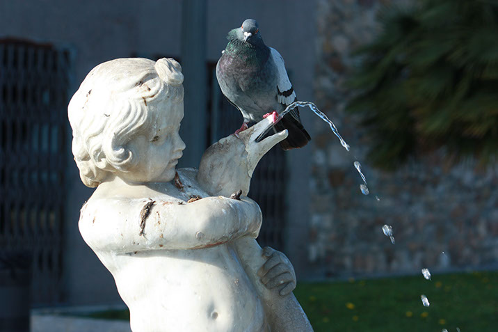 Le pigeon regarde de haut son homologue figé dans les bras d'un ange condamné à crachoter tant qu'il y aura de l'eau à crachoter.