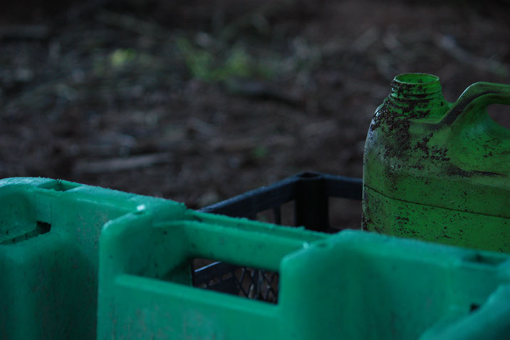 Qui a laissé ses affaires de jardinage au milieu du bois? Avec de la chance au détour d'un pin, vos yeux admireront des déchets, combien de temps mettront-ils à disparaître?