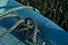 Un nœud lâche et corde qui tombe à l'herbe. La chaloupe bleu en retraite précoce s'ennuie de son propriétaire maintenant heureux de sa barque neuve.