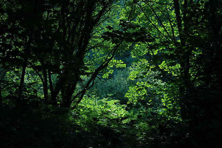 Dans le bois, la clairière est illuminée de soleil esquissant un halo vert accueillant et confortable. Le sommeil tombera allongé sur un nid de mousse.