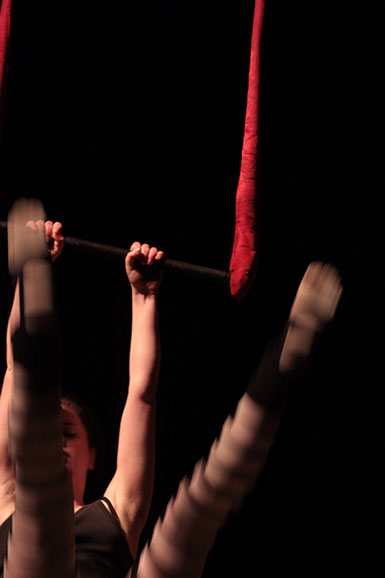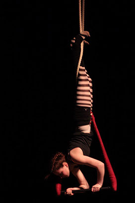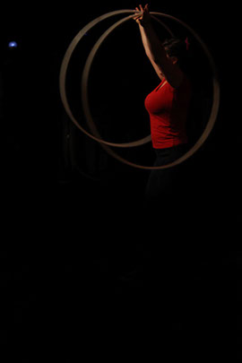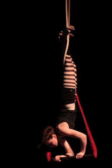 Accrochée à son trapèze, son corps tombe et s'élève autour de l'incertain axe suspendu. Tonique la trapéziste se balance au fil de la musique.