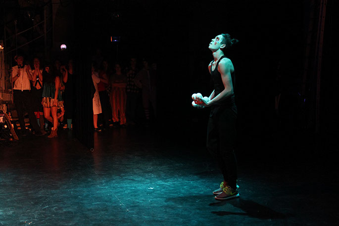 Seul face aux 320 regards il pratique le versatile jonglage, les voix invisibles des coulisses l’acclament, ce soir aucune balle ne choira avant que le noir théâtral ne tombe.