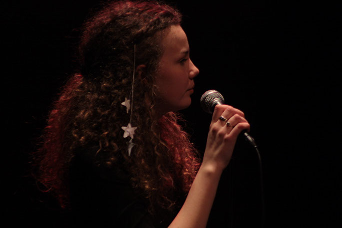 Le cœur suivant les musiciens à l'écoute, ses battements poussent sa voix dans le sombre de la nuit. La chanteuse ce soir est guidée par les musiciens.